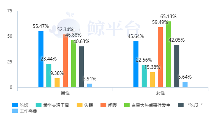 在看新闻的场景选择上,男女生的偏好也有差异。男生有55%选择边干饭边看新闻,女生有65%表示,会在发生重大热点事件时浏览新闻。