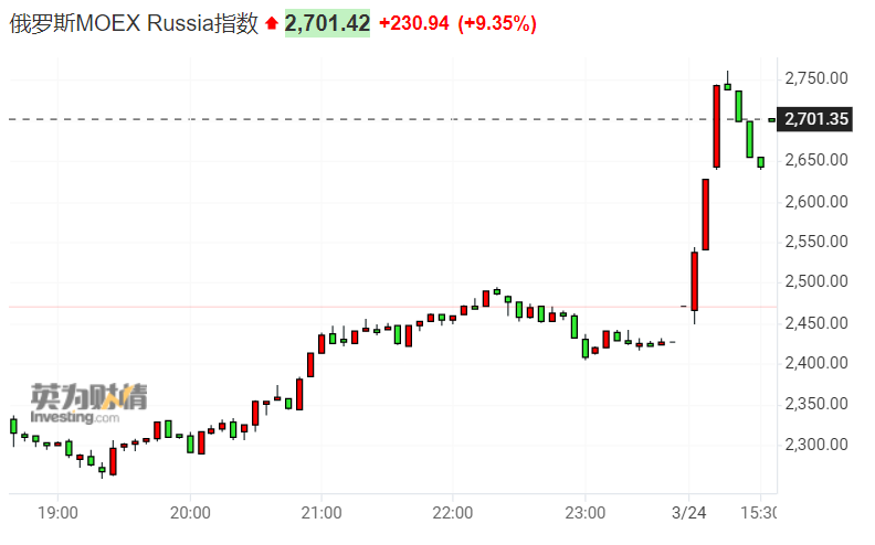 俄罗斯MOEX指数周四开盘上涨1.3%,随后扩大至11%,最新涨幅收窄至9.35%。