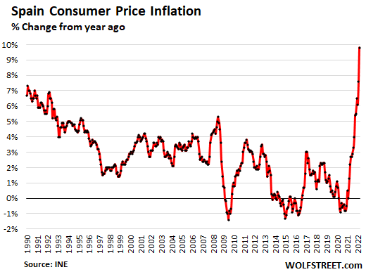 西班牙统计机构INE的初步预测中,西班牙3月的消费者价格通胀率比上月上涨了3%,年化率为36%;同比增长了9.8%,创下1985年3月以来的最高记录。