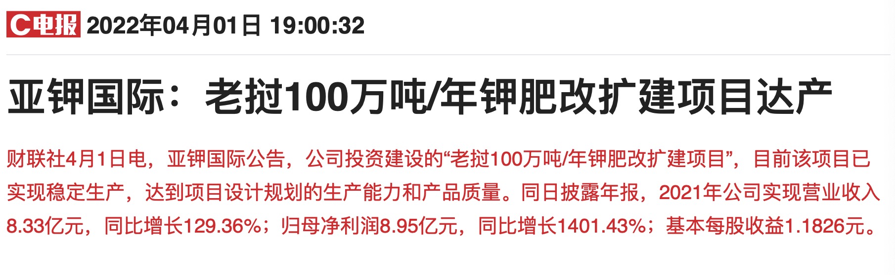 亚钾国际同时披露年报,2021年营收8.33亿元,同比增长129.36%;归母净利润8.95亿元,同比暴增1401.43%,刷新业绩历史新高。