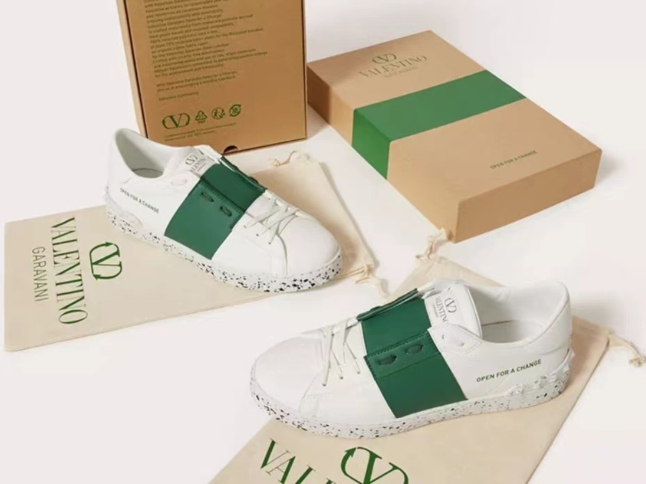 奢侈品牌方面,意大利高级时装屋Valentino通过推出其全新的“Open for a Change”可持续发展项目来提高可持续性。据品牌称,Open for a Change项目将为其两款标志性运动鞋款——Open和Rockstud Untitled进行可持续性的重新设计,包括部分使用回收和生物基材料。该技术以生物基材料——一种由玉米衍生多元醇制成的粘胶纤维和聚氨酯为基础,用来替代皮革材质。该材料广泛应用于两款鞋型的鞋面部分和Open鞋款的侧带部分,Rockstud Untitled上的铆钉同样是由再生尼龙制成。这种可持续主义同样反映在鞋盒和包装上,它们由完全回收的棉和原料来自可持续管理的森林制成的纸。