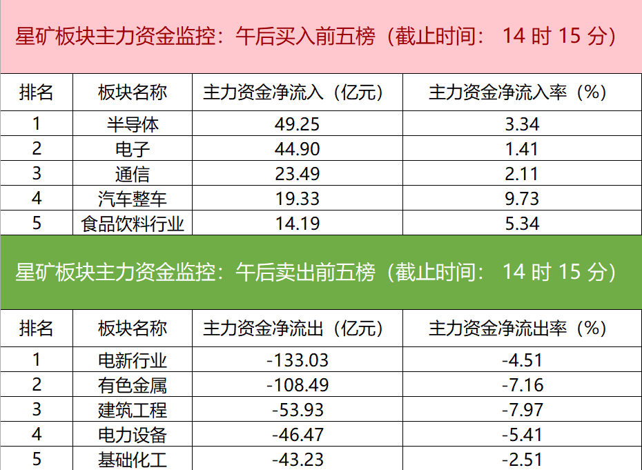 【主力资金监控:兆易创新净买入超25亿】财联社3月16日电,财联社星矿数据显示,今日主力资金净流入半导体、电子、通信等板块,净流出电新行业、有色金属、建筑工程等板块,其中电新行业净流出超133亿元。个股方面,兆易创新资金净买入25.60亿元位居首位,新易盛、比亚迪、中际旭创主力资金净流入居前;中国电建遭净卖出超14亿元位居首位,紫金矿业、华工科技、中国能建主力资金净流出额居前。
